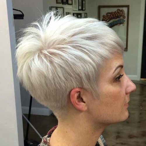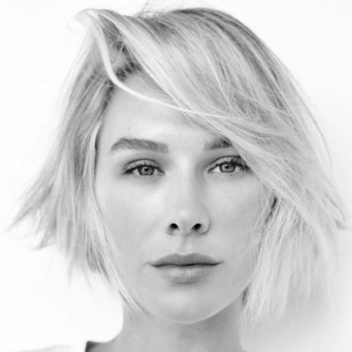 Essa é uma variação do pixie. É bem curtinho também, só que as lâminas laterais são em um efeito degradê. Esse tom de platinado combina muito com o corte.