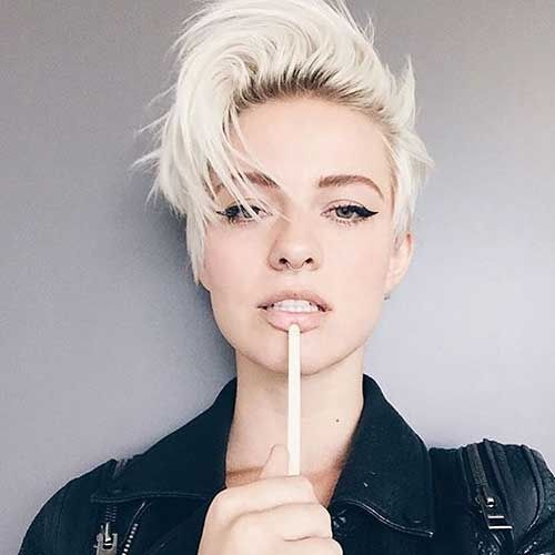 20. Corte de cabelo curto pixie com franja assimétrica platinado