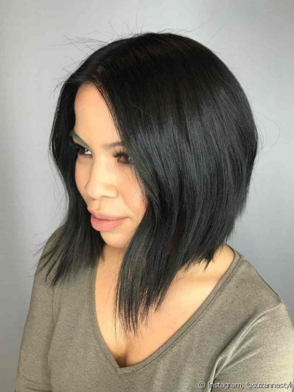 Esse corte vai até acima dos ombros e tem uma camada sutil para formar uma franja alongada. Veja na foto como essa segunda camada ajuda a alongar e criar um desenho mais harmônico no rosto todo, do queixo à testa. É um corte mais tradicional para quem prefere ser mais discreta, porém que permite prender e fazer penteados com mais liberdade.