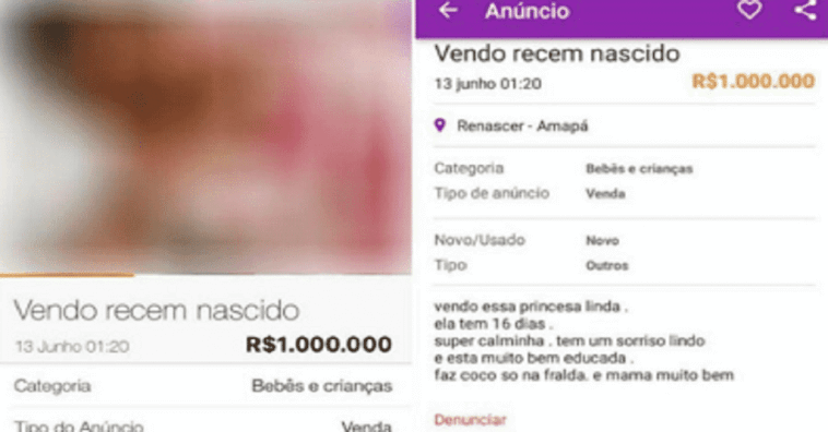 Se não houvesse provas podiam pensar que é mentira, mas infelizmente a notícia é verdadeira. Criança é colocada à venda na internet pelo próprio pai, no site de vendas OLX. O caso aconteceu nas redondezas da cidade de Macapá, no norte do Brasil. O anúncio absurdo pedia 1 milhão de reais pelo bebê, uma menina ainda recém nascida.