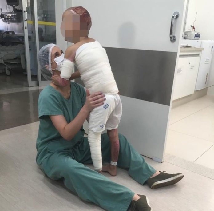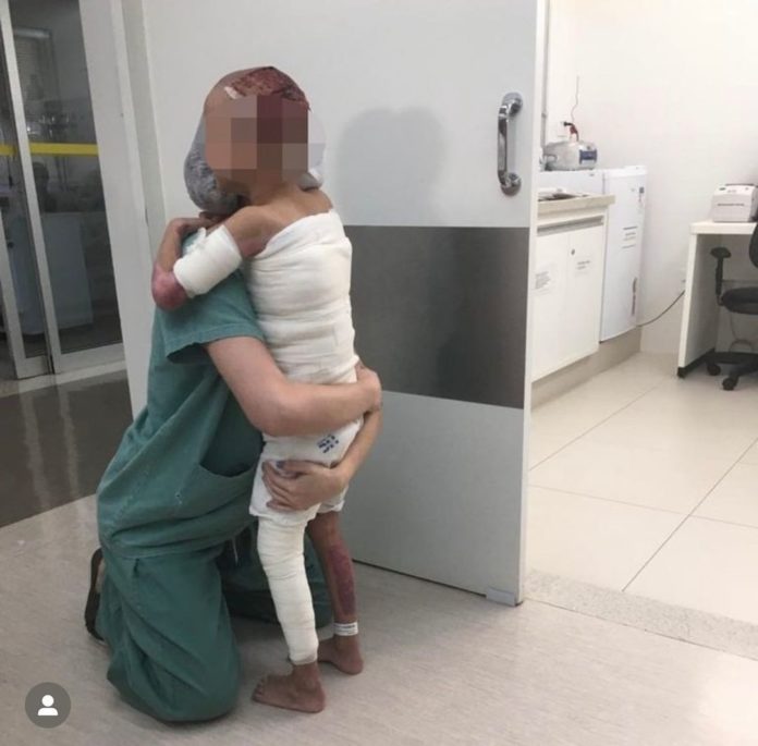 A criança, que sofreu queimaduras graves em todo o corpo após um acidente com álcool, precisou reaprender a andar.