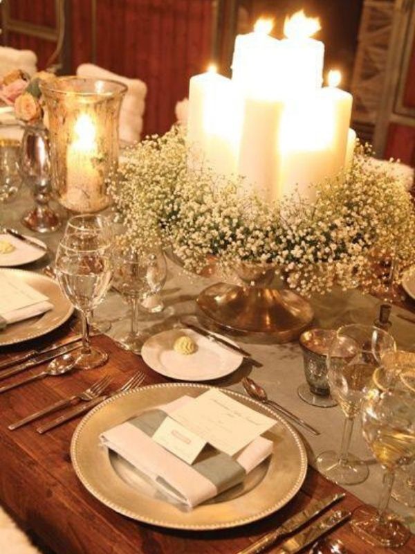 Se for oferecer um jantar, pode decorar a mesa com lindos arranjos, como esse com velas brancas e mosquitinhos, essas lindas flores bem delicadas. Com o branco e as velas, que são mais neutros, você pode utilizar várias outras cores para decorar, pois vai combinar.
