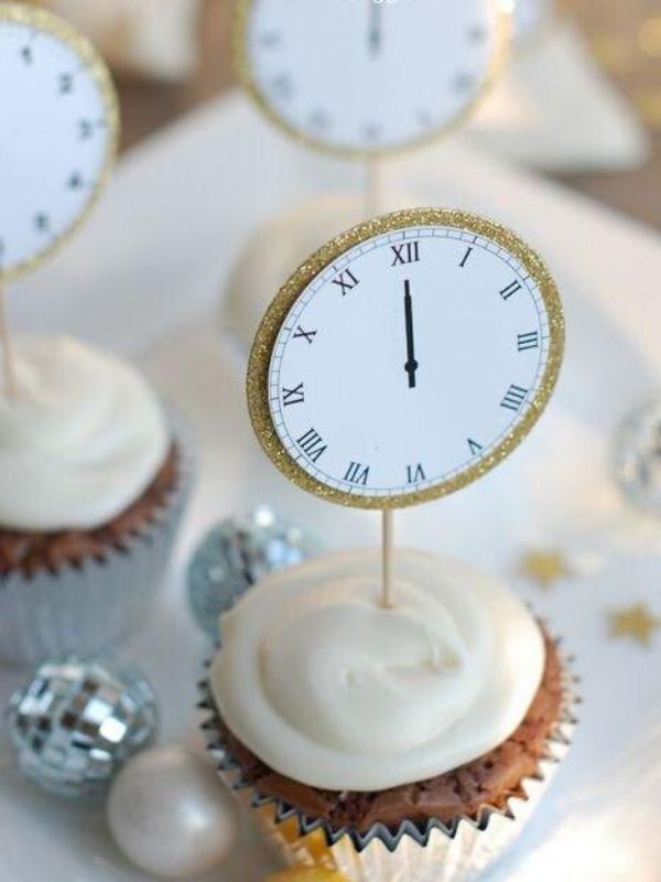 Os cupcakes estão entre os doces mais populares de todas as festas, então acabam por também fazer parte da decoração. Coloque sobre cada um palitinhos com alguma figura de papel relacionada ao ano-novo na ponta e já será o suficiente.