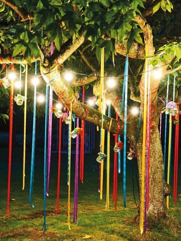 Seja dentro de casa ou ao ar livre, a decoração com fitas também é muito interessante e animada. Você pode fazer com fitas coloridas ou, também com branco e prateado ou dourado. Pendure no teto de todo o cômodo, fica muito festivo.