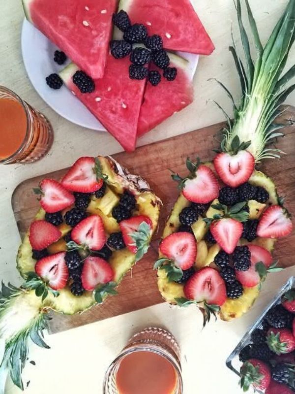 Já que é verão, não se esqueça de montar uma linda mesa repleta de frutas tropicais, bem coloridas, para todo mundo se servir. Fica muito convidativo.