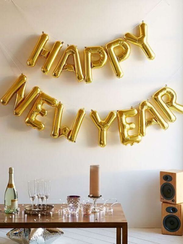 Balões representam muito bem qualquer tipo de decoração. Para a festa de ano novo, as cores dourado e prateado são as mais comuns. A dica é alugar um cilindro de gás hélio, pois fica muito mais bonito quando os balões ocupam as paredes e o teto, voando por todo o lado.