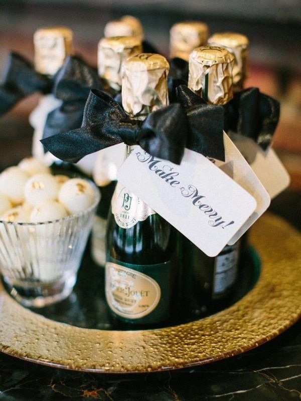 Todo mundo quer estourar um espumante à meia-noite, então você pode comprar garrafinhas em tamanho mini que vão decorar sua festa e, depois, cada convidado pega uma para comemorar.