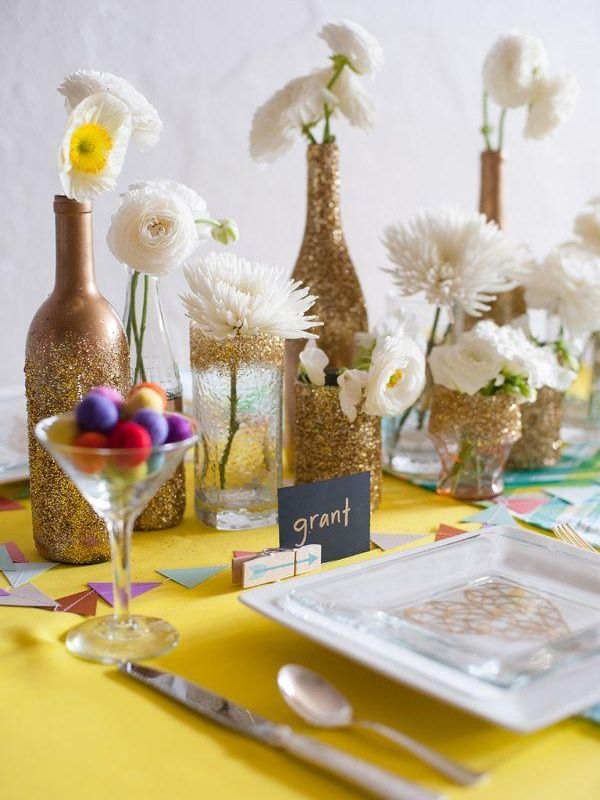 Você pode ir juntando várias garrafas de vidro até a véspera da sua festa, depois fazer garrafas decoradas de forma artesanal para decorar as mesas do ambiente.