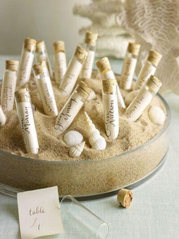 Vai fazer uma festa na casa da praia? Então a dica é fazer uma mesinha com pequenos tubinhos que levam mensagens positivas dentro. Cada convidado pode pegar a sua. Enterre os tubinhos em areia de praia e decore com conchas.
