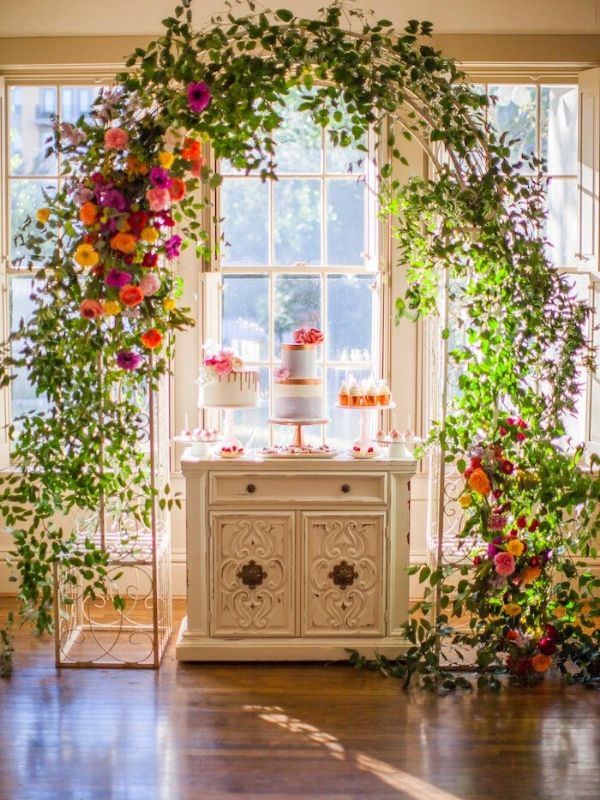 Se for fazer a festa ao ar livre, a decoração já vai estar pronta sem precisar de muito esforço, pois a natureza é o cenário perfeito. Só o que vai precisar é montar uma mesa com um painel de fundo para ambientar as fotos. Você pode usar um pórtico antigo de madeira para deixar o visual mais rústico, combinando com o estilo campestre.