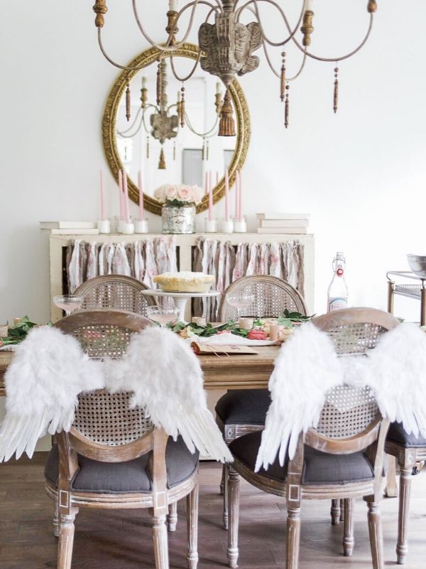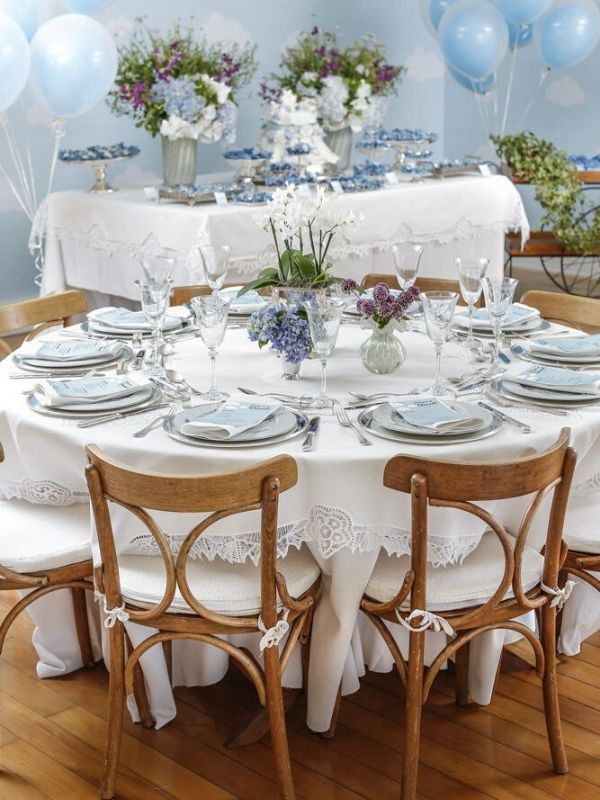 O tema anjos é um dos mais escolhidos para a decoração de batizado, e não é por acaso. Nesse momento, o que todos desejam é que seu filho esteja abençoado pelo anjinho da guarda dele. Então, se escolher essa temática, uma linda ideia é decorar as cadeiras com asas de anjos.