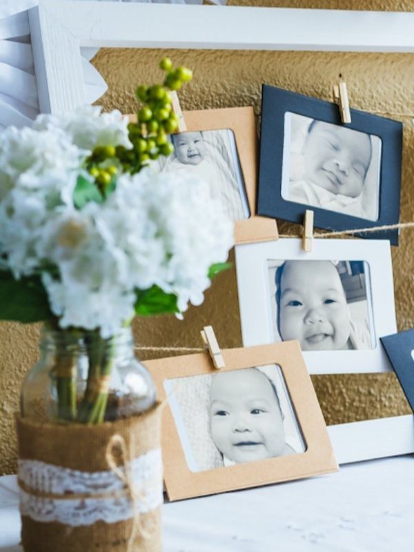 Outra linda forma de agregar mais valor à decoração do batizado do seu filho é criando murais com fotos dele, seja sozinho ou junto dos pais, padrinhos e familiares. Pode fazer com ou sem molduras, em formato de varalzinho ou pode espalhar retratos emoldurados pelo ambiente.