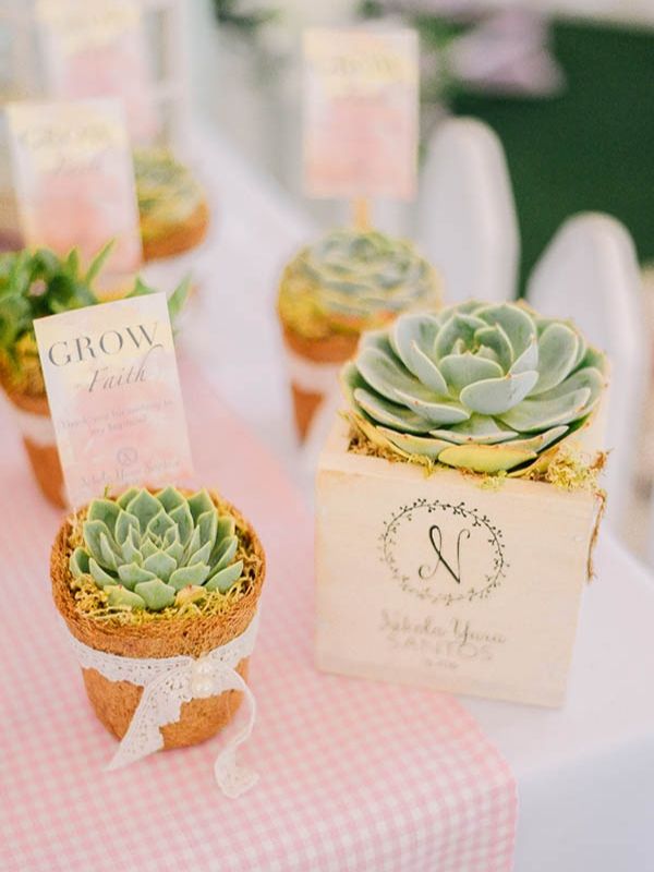 As suculentas são plantinhas de aspecto muito delicado, lindas e que combinam muito bem com a ocasião. Como elas são resistentes, também podem ser usadas para entregar de lembrancinha aos convidados.