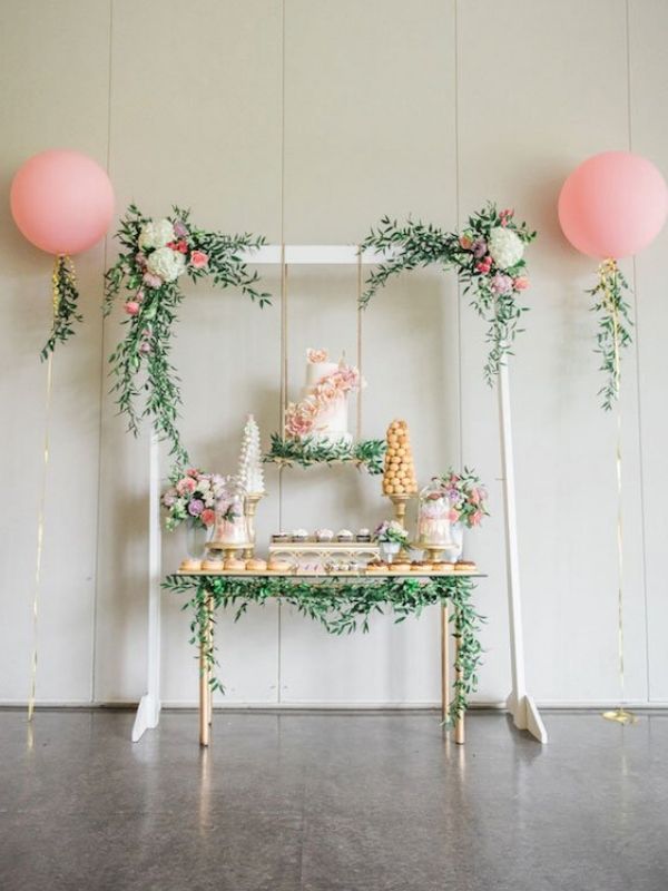 Se não quiser ou não puder decorar todo o ambiente, faça apenas um espaço com um painel simples, usando ramos de flores naturais ou artificiais para emoldurar a mesa do bolo. Balões também são um lindo complemento.