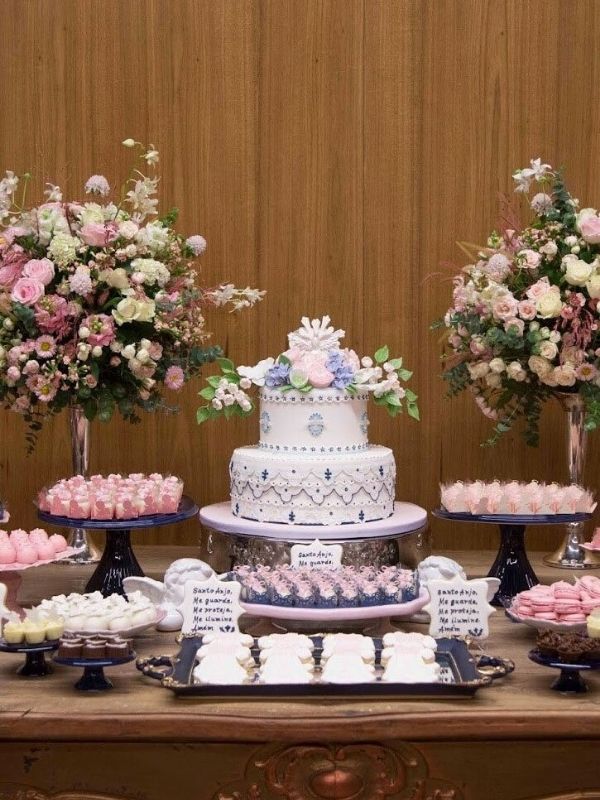 Mais uma vez as flores se mostram uma opção perfeita para a decoração de batizado. Com dois grandes vasos de flores mistas, um de cada lado do bolo, você vai preencher a mesa com muita beleza e suavidade.