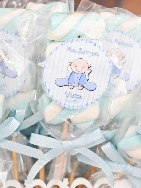 Não se esqueça das lembrancinhas, que podem ser bem simples, como pirulitos de chocolate, marshmallows, vidrinhos com essências, um pequeno retrato do bebê ou um cartão com uma mensagem e um terço.