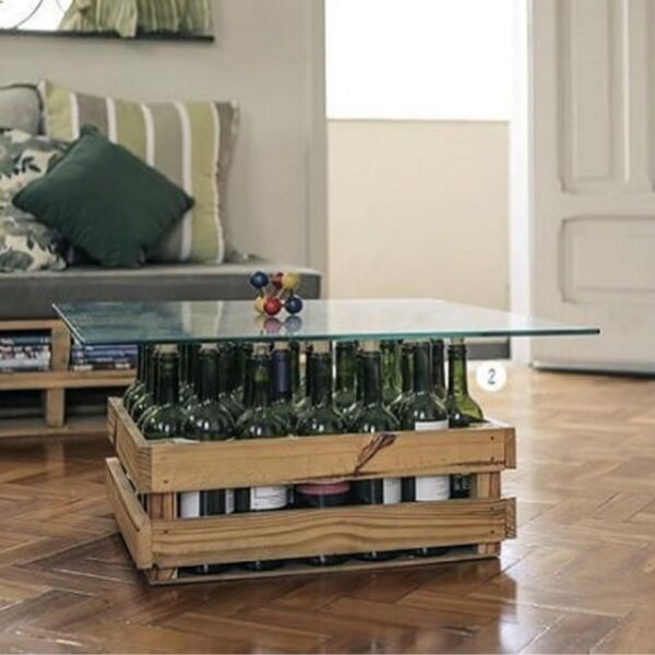 Outra ideia mais simples e rústica, que também ajuda a reciclar outros materiais, é essa mesinha de centro em que o caixote foi todo preenchido com garrafas de vidro e depois ganhou um tampo de vidro com apoios na parte de baixo para ficar bem firme. Para esses apoios pode usar cortiça.