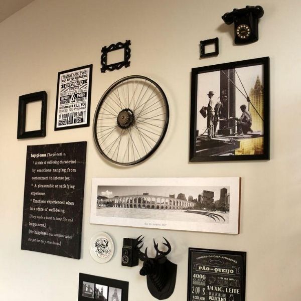Na temática de antiguidades, essa parede ganhou quadros mesclados com objetos