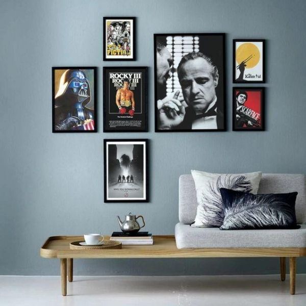 Com quadros de tamanhos variados a parede vai ficar mais dinâmica e com mais profundidade, e o visual vai ficar mais despojado. Mas, não é uma regra. Se quiser fazer uma composição conceitual, vale usar todos os quadros iguais, em tamanho, modelo, cor, estilo das imagens e espaçamentos idênticos entre eles.