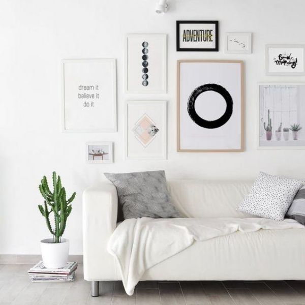 Antes de começar a pendurar ou encostar quadros na parede, planeje como quer que fique o resultado. Delimite o espaço onde os quadros serão dispostos, considerando a quantidade de quadros que pretende colocar, deixar uma distância de uns 30 centímetros de uma mesa ou sofá que esteja encostado na parede, e procurar manter a composição na altura dos olhos, metade da altura da parede.
