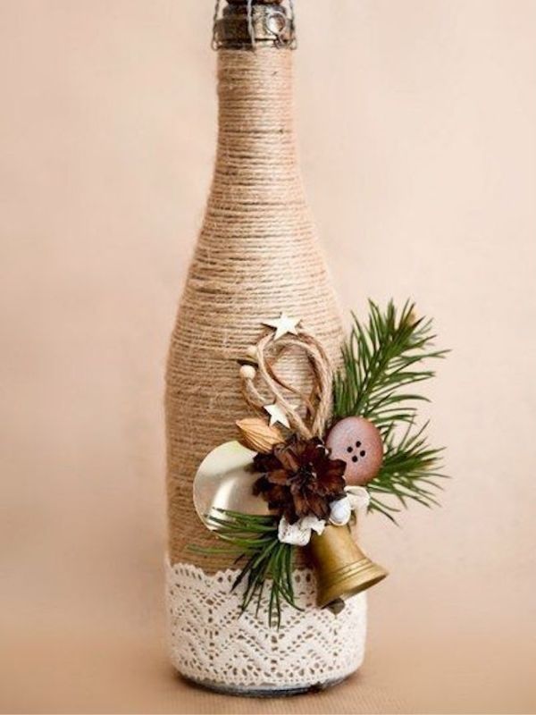 8. Renda, barbante cru e enfeite simples para garrafas fechadas