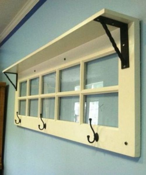 Essa é uma ideia com janela diferente, de vidro e esquadrias de madeira. Ela recebeu uma tábua na parte de cima para ser decorativa, e ganchos para pendurar os casacos e sombrinhas. É uma ótima sugestão para colocar no hall de entrada da casa.