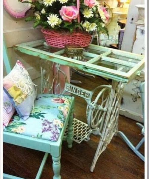 Essa mesinha é feita com a parte de baixo de uma máquina de costura antiga e, sobre ela, uma janela com vidro. Acaba por virar uma linda mesa decorativa que fica ótima em um ambiente de estar, atelier ou no jardim.