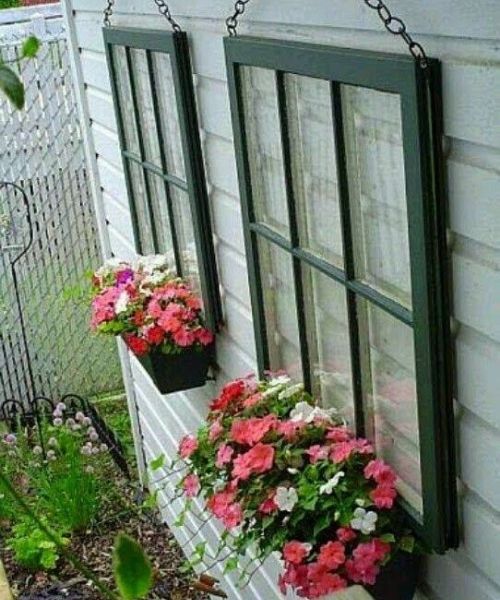 Na decoração interna ou externa da casa, quando envolve floreiras, você pode usar uma janela antiga de suporte. Assim, as floreiras ganham um outro valor, muito melhor do que apenas apoiadas no chão ou sobre um balcão.