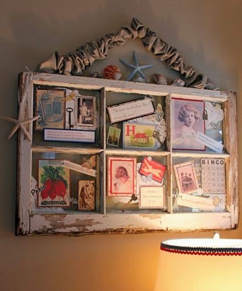 Por fim, uma ideia para as salas e quartos da casa. Com uma janela de vidro é possível fazer um lindo mural de fotos da família e amigos, ou de outros tipos de lembranças, como cartas, postais e o que mais trouxer boas recordações.