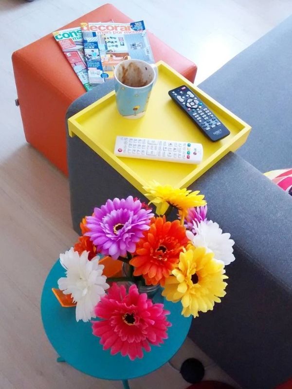 3. Um pufe, uma bandeja, flores…