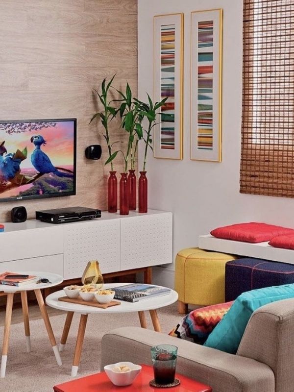 5. Mesinhas e rack com design moderno e cores claras, combinados com vários elementos decorativos coloridos