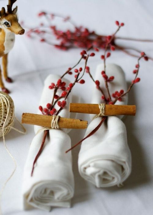 Os porta-guardanapos são itens que se pode variar bastante e ajudam a complementar lindamente a decoração da mesa, mesmo quando são bem simples. Esse modelo traz um pau de canela e um raminho.