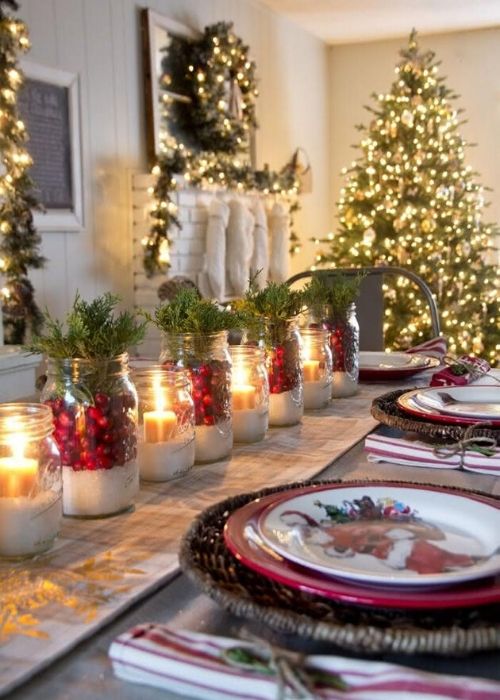 Outra linda ideia é colocar velas dentro de taças de vidro e espalhar pelo comprimento da mesa, bem no centro. Nesse caso, a iluminação da sala ou cozinha deve ser mais baixinha, de preferência só com a luz do pisca-pisca e das velas.