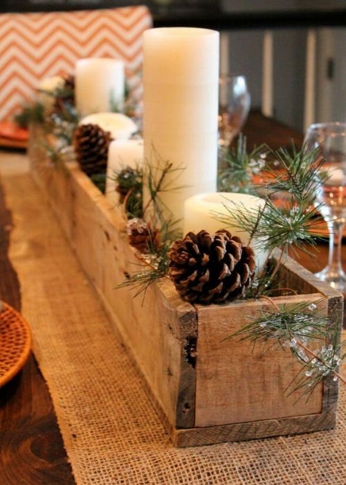 Esse arranjo é uma simples caixa de madeira decorada com grandes velas brancas e itens rústicos, para uma mesa nesse estilos.