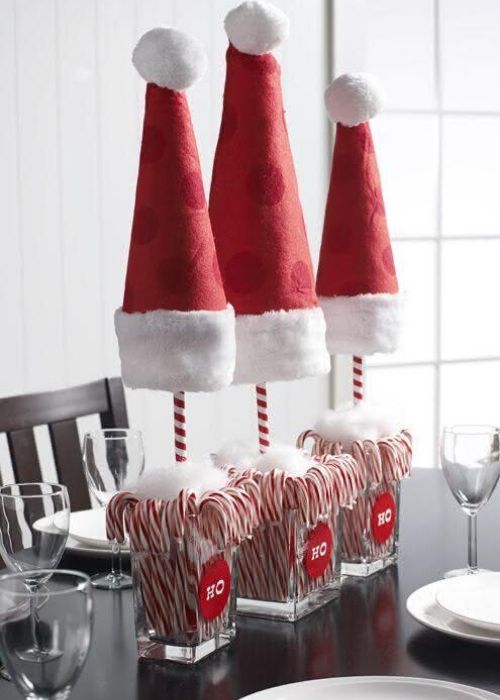 Essa também é uma decoração bem fácil de fazer, basta comprar gorrinhos de Papai Noel e aquelas bengalinhas típicas, organizando-as dentro de caixinhas de acrílico.