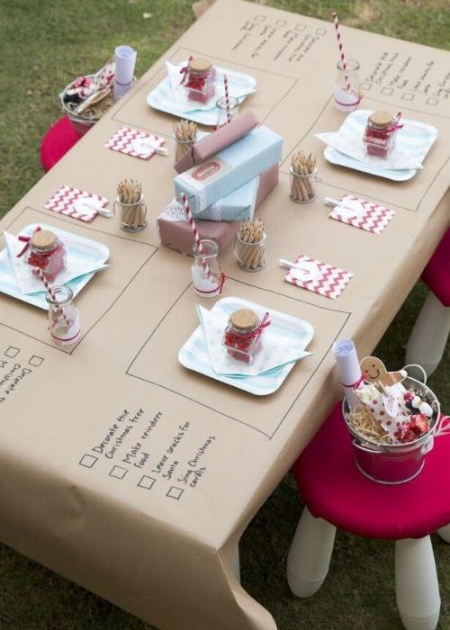 Se não quiser comprar toalhas e arranjos, compre um pedaço de papel pardo, que é bem baratinho, e faça nele os desenhos da decoração de Natal. Mais do que uma ideia barata, é muito criativa, diferente e depois é só descartar o papel sem precisar lavar toalhas.