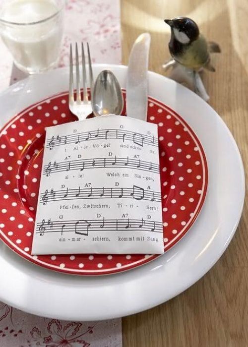 As canções de Natal são bem marcantes nessa época, então você pode escolher na internet partituras das músicas Natalinas, imprimir e recortar como pequenos envelopes para organizar os talheres.
