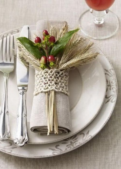 Mais uma ideia para colocar sobre os pratos é utilizar raminhos de trigo ou raminhos de pinheiro. Fica delicado, simples e muito bonito.