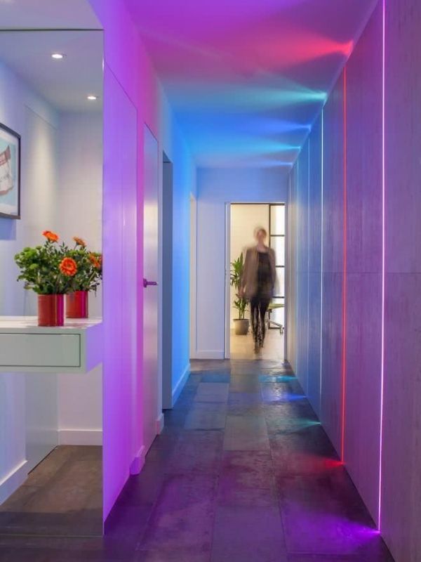 Quer um corredor cheio de estilo, mas clean e minimalista? Pode simplesmente escolher iluminar com feixes de LED colorido e mais nada.