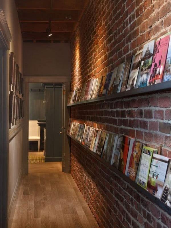 Essa parede de tijolinhos pode ser feita usando um papel de parede com essa estampa. Depois é só colocar prateleiras estreitas e os seus livros ou quadros.