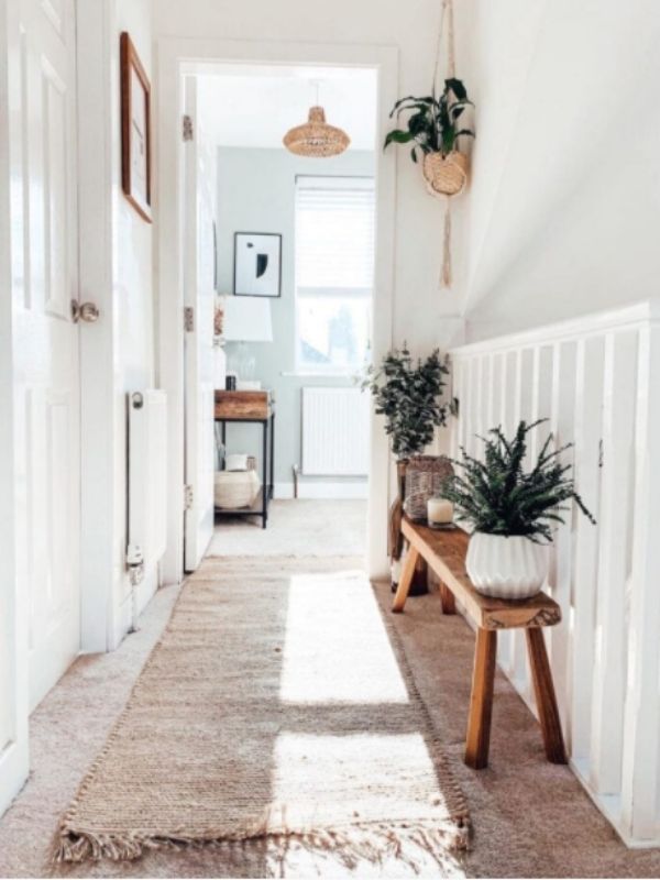 Se não quiser colocar muitos objetos no corredor, essa ideia com um aparador simples de madeira e um tapete é linda.