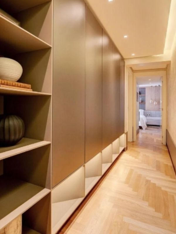 Mais uma sugestão para corredores bem espaçosos é aproveitar ambos os lados com armários e prateleiras, tanto para armazenamento quanto para decoração.