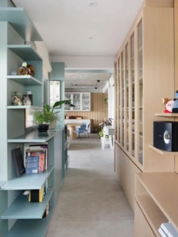 Se tiver um pouco mais de largura no seu corredor, pode apostar em prateleiras multifuncionais presas apenas no teto, criando esse visual bem leve.