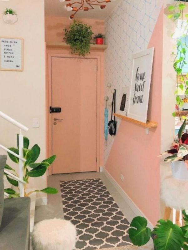 Gosta desse estilo de decoração moderninho, bem Instagram? Os tons pastéis e metalizados com plantas são ideais, e veja que funciona mesmo com espaços pequenos. Essa dica da parede com duas cores é ótima para valorizar a parede e não precisar incluir muitos objetos logo na entrada.