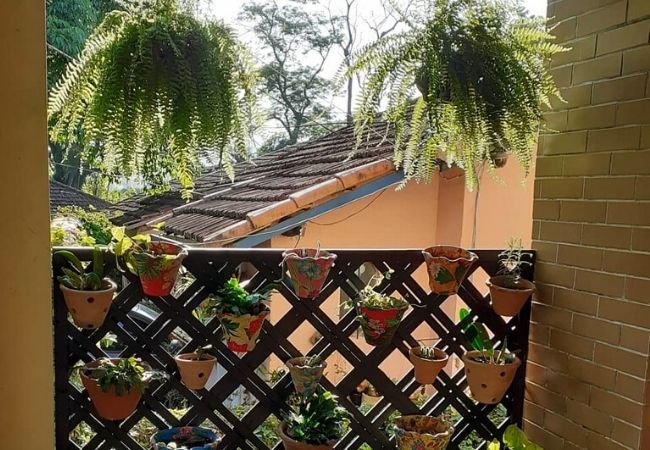 Agora não tem desculpa! Por menor que seja seu espaço, tem sempre um cantinho perfeito para suas plantas. Olha que gracinha essa treliça com vasos, em harmonia com as samambaias.