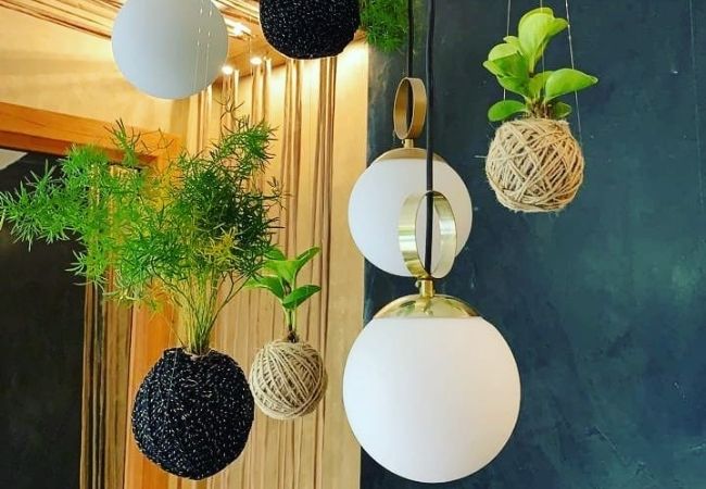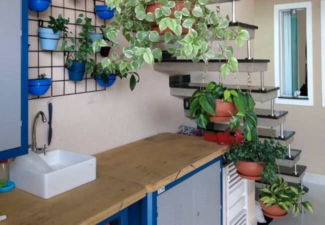 Com um ar mais moderno, essa forma de integrar as plantas na decoração não deixa a desejar. Se quiser uma versão mais minimalista, aposte em uma só cor para os vasos e as luminárias e pronto.