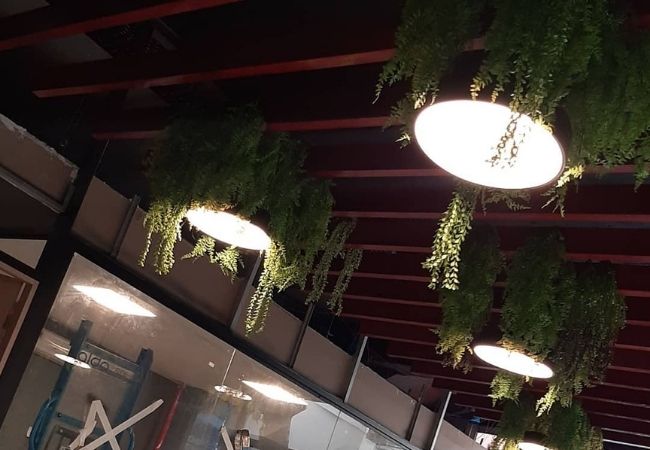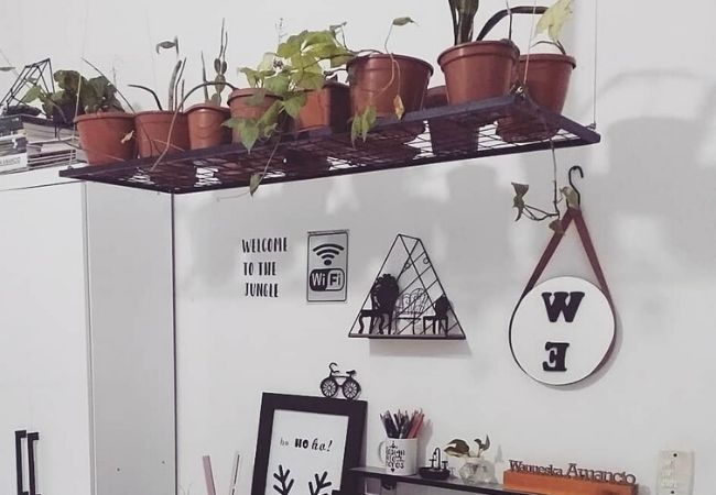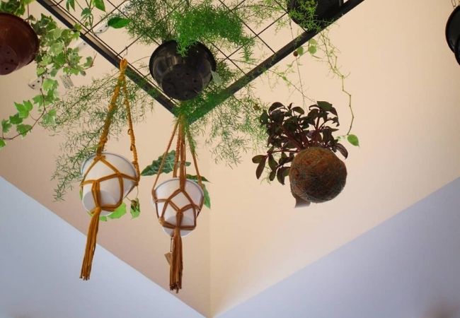 Transforme seu ambiente colocando uma treliça de metal bem fixada no teto. Nela, coloque seus vasinhos favoritos, preferencialmente com plantas pendentes, de sombra e com pouca manutenção. Tente alguma planta de sombra ou uma pendente.