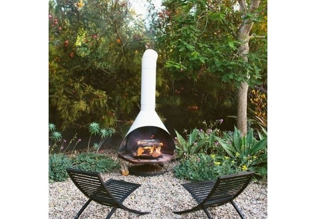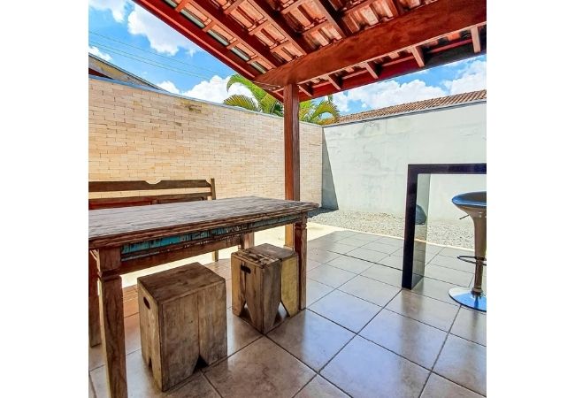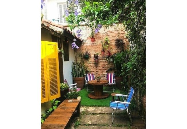 11. Quintal sem verde, mas cheio de aconchego com móveis de madeira de demolição