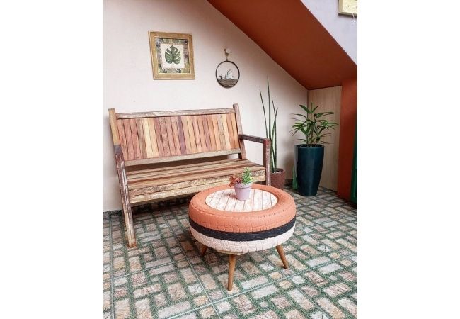 12. Um cantinho pequeno, simples e aconchegante para aproveitar o sol, com mesa feita de pneu