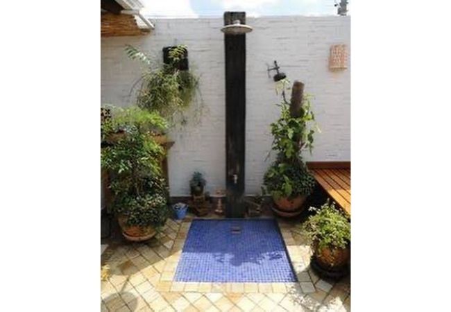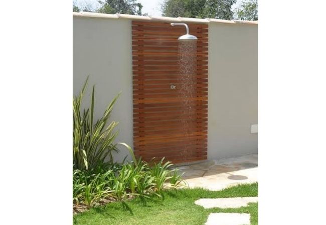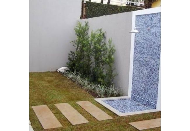 14. Mais uma ideia de chuveiro externo com parede de ladrilhos, a cara do verão